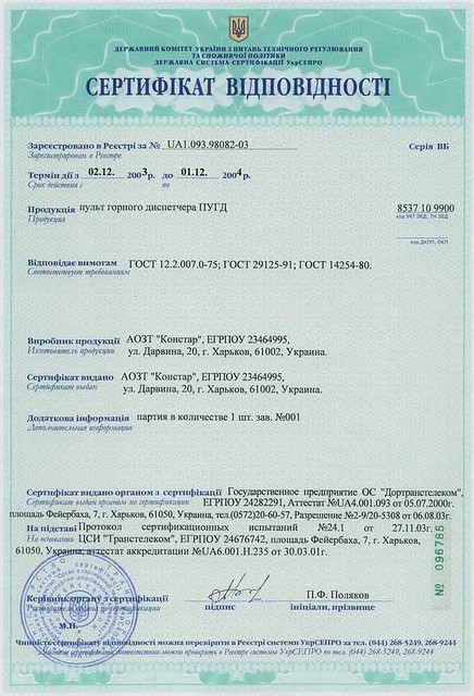 Сертификаты и лицензии компании «АО «КОНСТАР»»